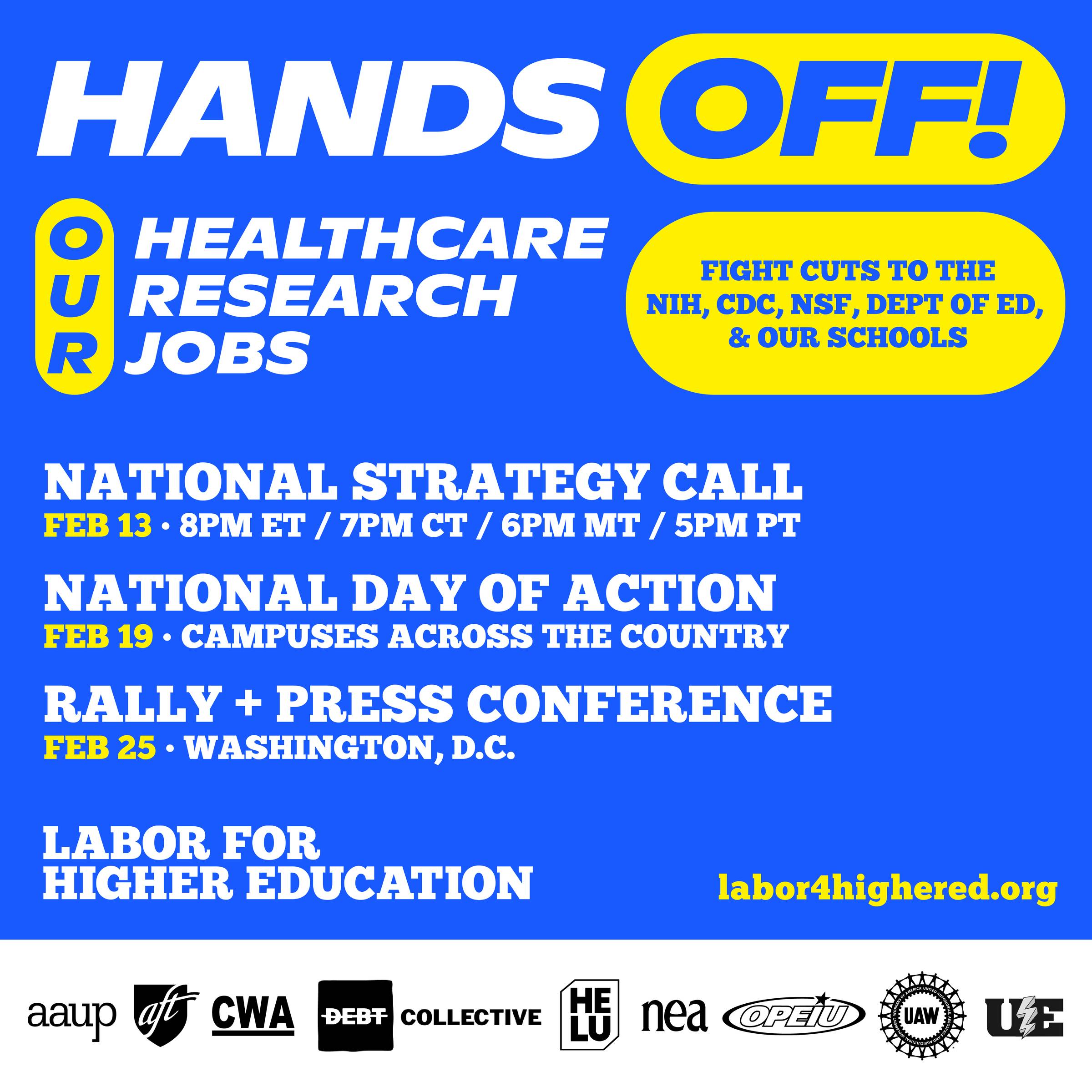 Without mass resistance, these attacks will result in layoffs, program & school closures, and devastation to local economies that depend on the economic impact of these colleges and universities. Lifesaving research on topics such as cancer, viral pandemics, heart disease, diabetes, and Alzheimer’s won’t be completed, or even begun. Higher ed workers – long facing growing job precarity – are now facing unprecedented job insecurity. On February 19 higher education workers, students, and allies will get in the streets and loudly proclaim: Hands off our healthcare, research, and jobs! "