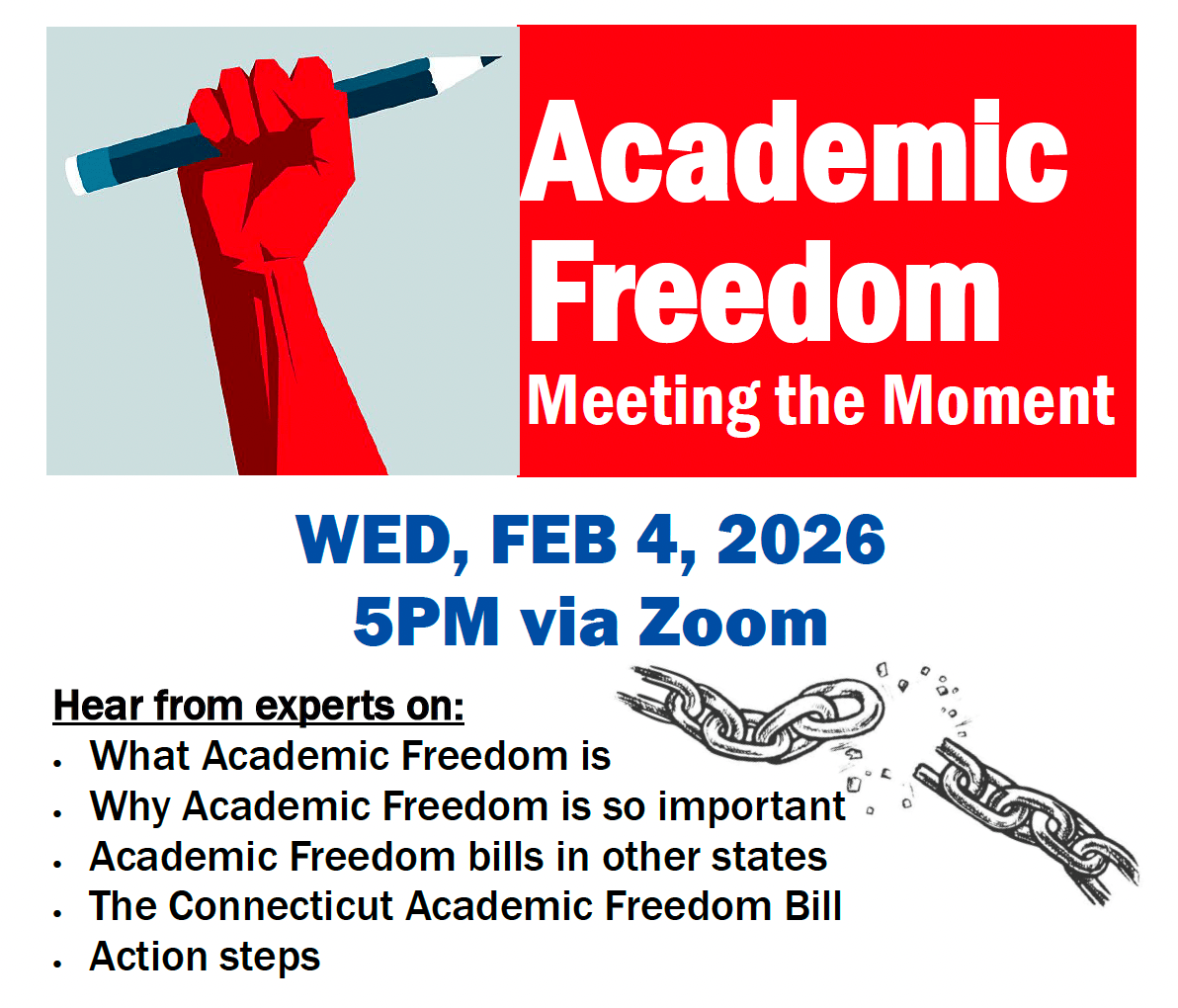 Academic Freedom in Connecticut: Our AAUP/AFT chapter network in CT has put together this important webinar about the state of academic freedom in our state as well as Academic Freedom legislation in other states. Our network is drafting Academic Freedom legislation for CT.