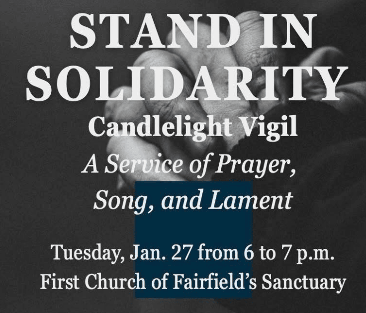Stand in Solidarity: Attend a vigil for victims of I.C.E. brutality, Tuesday Jan 27, 6 - 7 pm at First Church, 148 Beach Rd. Fairfield. Let's gather together as a community to support our immigrant and refugee neighbors and bear witness to the truth.